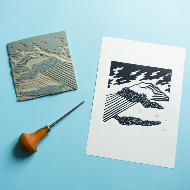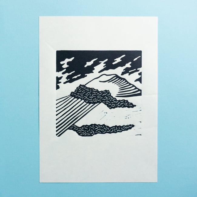 Limited edition one colour lino cut print, printed by the artist on 90gsm Japanese Ho-Sho paper by hand.