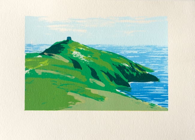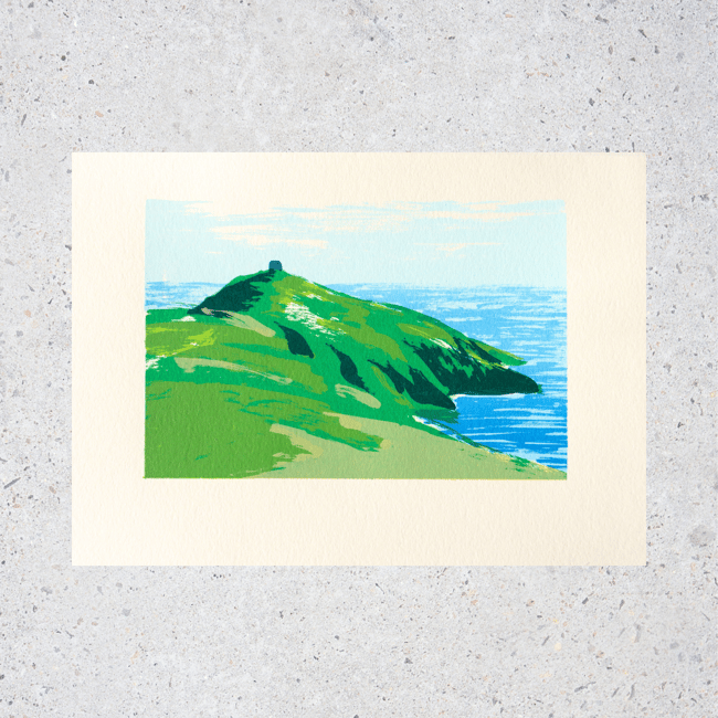 Limited edition silkscreen print of Rame Head, Cornwall. Printed in 6 colours by hand on an option of 250gsm cream Fabriano Unica paper or 250gsm white Fabriano Unica paper.